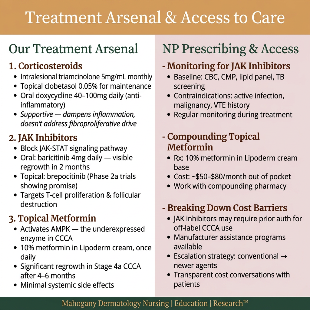 Cost and insurance coverage are real barriers we need to navigate. JAK inhibitors approved for rheumatoid arthritis or alopecia areata may not be covered for off-label CCCA use. Compounded topical metformin typically costs patients $50-$80 monthly out of pocket. We need to have transparent conversations about cost and work with patients to find financially feasible approaches, whether that's starting with less expensive conventional therapies and escalating to newer agents if those fail, or helping patients access manufacturer assistance programs and copay support.