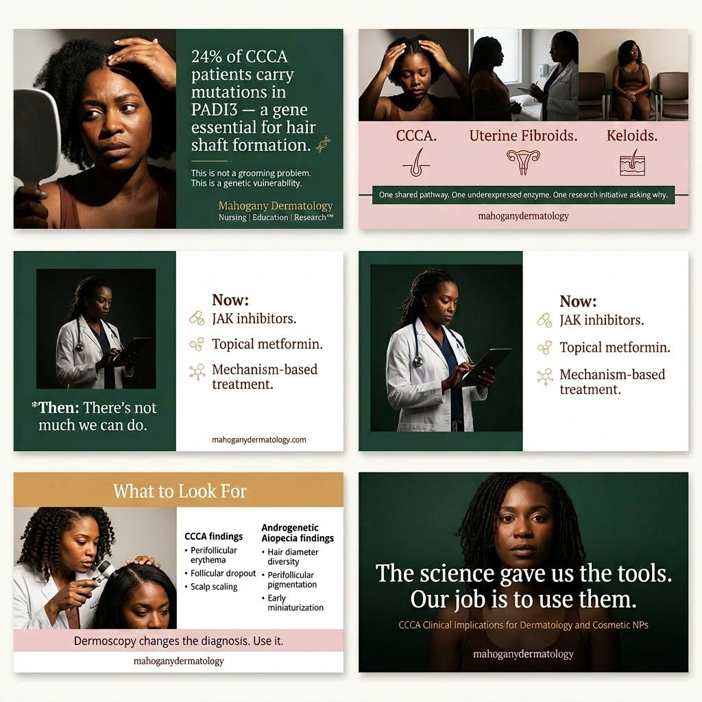 First, we need to improve our diagnostic acumen. CCCA is underdiagnosed, often dismissed as androgenetic alopecia or attributed entirely to grooming trauma without proper investigation. When a Black woman in her thirties or forties presents with progressive vertex alopecia, CCCA should be high on your differential. Don't assume it's female pattern hair loss without examining for the characteristic signs: perifollicular erythema in early disease, the grayish perifollicular halos on dermoscopy, the centrifugal pattern of spread, the smooth scarred scalp in advanced cases.